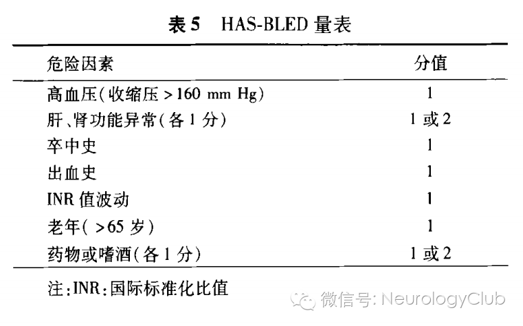 HAS-BLED量表为预测接受抗凝治疗心房颤动患者出血风险的量表(表5)。于2010年在欧洲心脏调查数据库基础上提出,研究发现随着HAS-BLED量表评分的增高,心房颤动抗凝患者的年出血率逐渐增加。当HAS-BLED量表评分≥3时提示出血风险较高,但不应将其视为抗凝治疗禁忌证。该评分在不同的国家及人群中得到验证。2010年欧洲心房颤动患者治疗指南及2014年美国AHA/ACC/HRS心房颤动患者管理指南均推荐使用该评分评估抗凝治疗患者的出血风险。2010年Pisters等在提出HAS-BLED量表时,还提出CHADS2和HAS-BLED量表联用可更好地指导心房颤动患者卒中风险分层及抗凝药物应用,对于CHADS2量表评分≥2的使用口服抗凝药的心房颤动患者,当HAS-BLED量表评分>CHADS2量表评分时,风险大于获益。如何更好地将CHADS2、CHA2DS2-VASc量表评分及HAS-BLED量表评分结合,以更加准确地评估患者的获益与出血风险,需要进一步的临床研究解决。