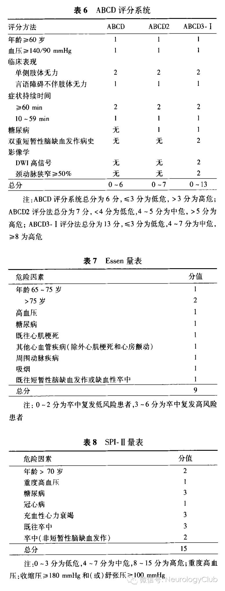 缺血性脑卒中及TIA后卒中复发风险高,早期识别高危患者有助于尽早开展卒中二级预防。常用的复发风险评估工具包括ABCD评分系统(表6)、Essen量表(Essen Stroke Risk Score,表7)和卒中预测工具-II(Stroke Prognostic Instrument II,SPI-II,表8)。