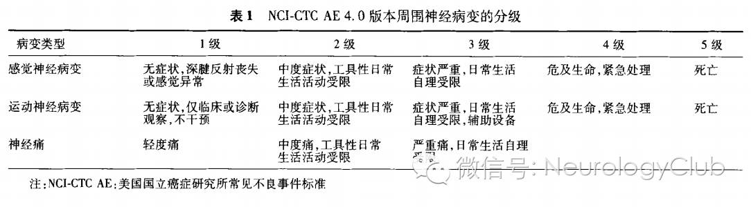 MMPN包括感觉神经病变、运动神经病变及自主神经病变,需根据美国国立癌症研究所常见不良事件标准(National Cancer Institute’s common terminology criteria for adverse events,NCI-CTC AE)4.0版本(表1)对PN的严重程度进行分级。