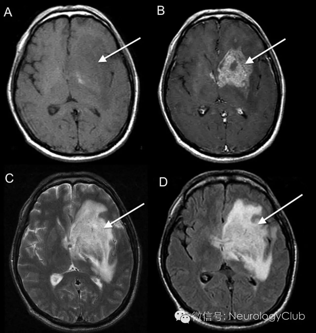 (图2:起初的头颅MRI。T1WI[A],T1增强[B],T2WI[C]和FLAIR[D]证实左侧基底节区的一较大的不均匀强化肿块[箭],颞叶,岛叶和直回后部均有累及,占位效应存在)