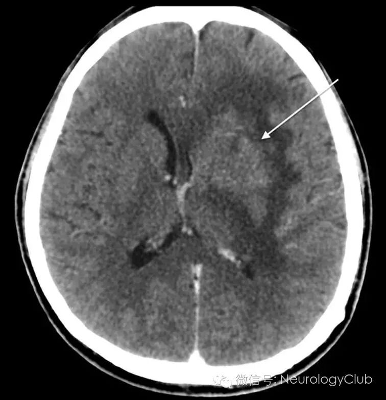 (图1:增强CT提示单发的52×41×38mm不均匀强化肿块,中心位于左侧豆状核[箭],中线偏移7mm,高度怀疑多形性胶质母细胞瘤)