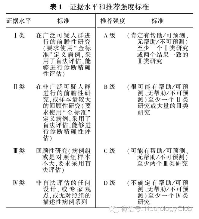 在文献检索基础上,根据纳入标准和排除标准进行文献筛选;再根据欧洲神经病学会联盟(EFNS)2004年发布的神经系统疾病管理指南的编制指南中关于诊断性证据水平分级标准确定证据级别(I、II、III、IV);最后根据证据水平,给出推荐强度(A、B、B、D)(表1)。 对于尚缺乏证据的重要临床问题,则根据经验,将推荐意见表述为“专家共识”。