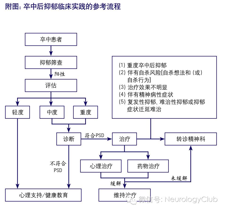 应对所有卒中患者进行多时间点筛查PSD,除询问卒中的病史外,着重询问患者的心境、愉快感、自卑和自责、轻生观念、迟滞、激越、注意、记忆、睡眠、食欲、体重、乏力等内容。如果患者有明显风险的抑郁症状存在,则需要更多的时间对患者的抑郁程度进行严格评估,有必要则对照诊断标准进一步明确诊断。但重度PSD患者建议请精神科医师会诊或者转诊。