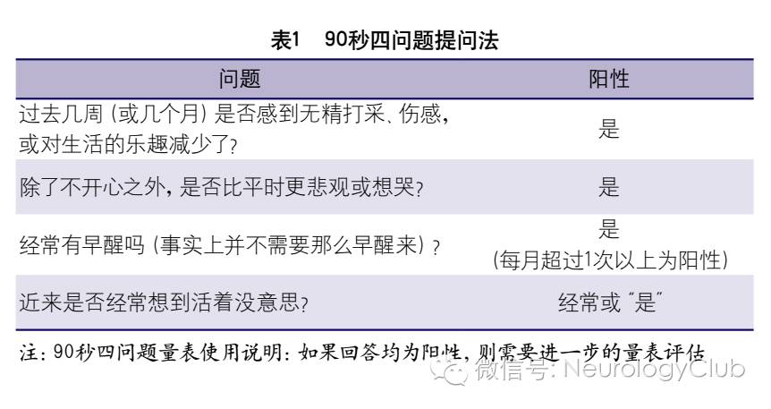 PSD可以发生在卒中急性期及康复期的任何阶段,常见于卒中后1年内,所有卒中后患者均应该考虑发生PSD的可能性。在筛查过程中,还应对PSD的风险因素进行评估,包括卒中后生存状态、功能依赖、认知损害、既往抑郁史、日常生活自理能力等,若有2个及以上的风险因素则容易发生PSD。由于评估PSD的最佳时间尚未确定,故PSD筛查建议在卒中后的多个不同阶段进行。特别是在病情反复(如急性加重或经久不愈)或治疗地点变更(如从急性治疗地点到康复治疗地点或在回归社会前)的时候,重复筛查是十分必要的。由于目前国内卒中人群数量非常庞大,故对卒中患者推荐使用一些简便易行的问卷以筛选可能的抑郁患者,如采用“90秒四问题提问法”(表1)或者患者健康问卷-9项(Patient Health Questionnaire,PHQ-9)量表。若“90秒四问题提问法”的回答均为阳性,或PHQ-9量表的前两项(①做什么事都没兴趣,没意思;②感到心情低落,抑郁,没希望)回答为阳性,则需要使用抑郁症状评估量表进一步评估抑郁严重程度。在实际临床工作中,临床医护人员也根据患者的具体情况和医生的经验,针对性地采用“90秒四问题提问法”进行询问。