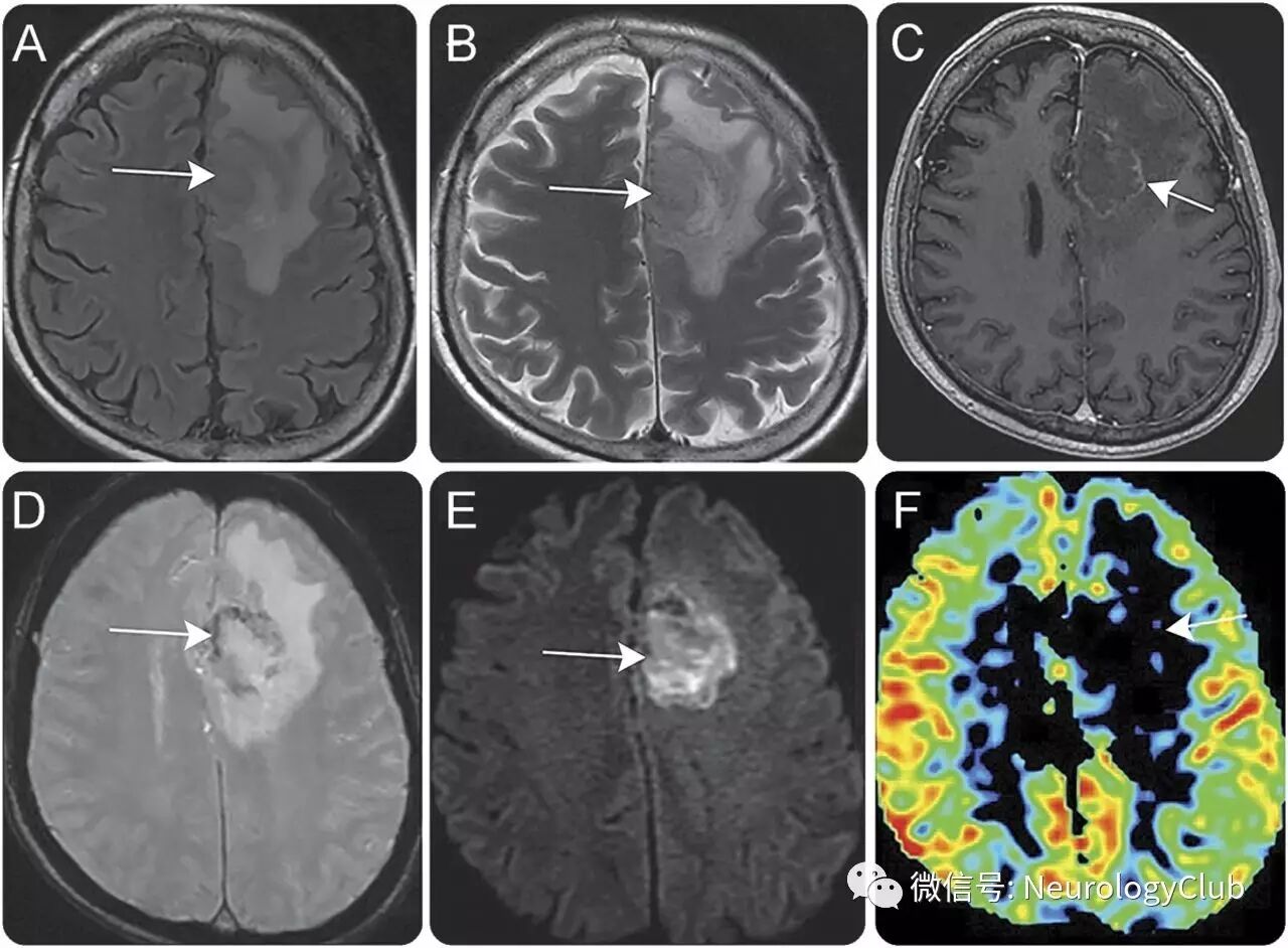 (图1:FLAIR[A]和T2WI[B]可见左侧额叶较大的脑内肿块[箭];T1增强[C]可见明显的周围强化[箭];磁敏感加权成像[D]提示病灶内出血[箭];DWI[E]和对应的ADC[未放图]证实弥散受限[箭];怀疑脑肿瘤,但动脉自旋标记灌注成像[F]提示低灌注[箭])