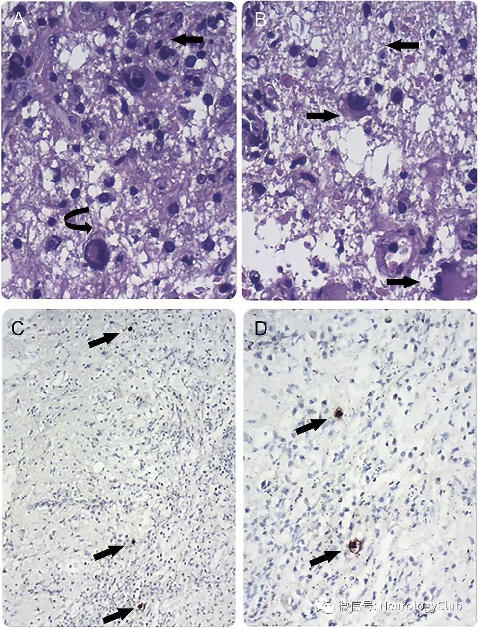 (图2:A-B:HE,×200,细胞病变效应伴细胞内嗜碱性包涵体[弯箭],炎症浸润伴坏死[直箭];C-D:免疫组化提示巨细胞病毒CCH2+DDG9克隆[箭],分别×40和×100)