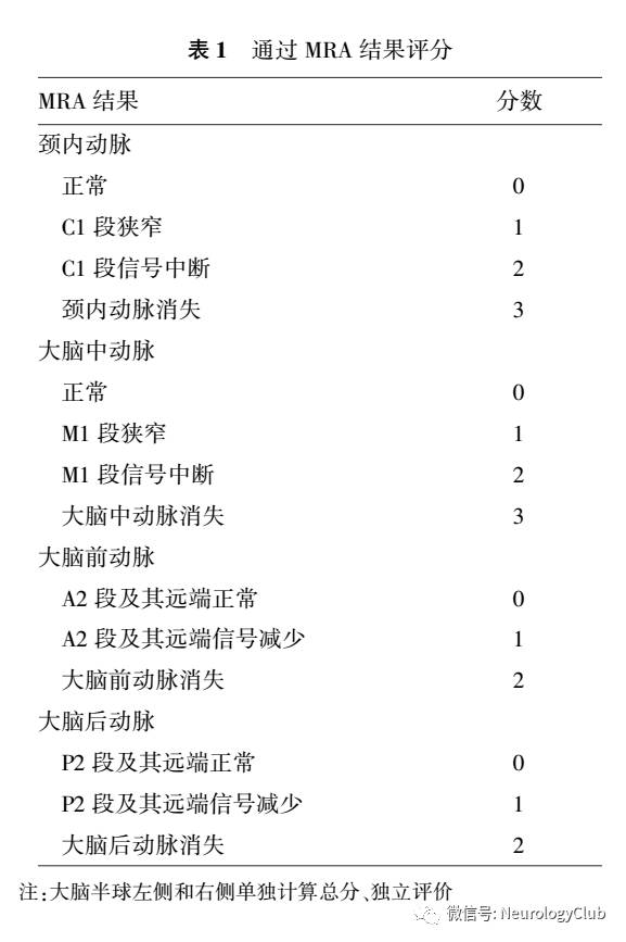 新指南中,脑血管造影仍为诊断烟雾病的金标准,同时可根据脑血管造影进行分期。新指南增加了通过MRA进行评估分期的新方法。在该评估系统中,对MRA结果进行简单评分后统计总分(表1),MRA总分为0-1时,对应MRA分期为1期;MRA总分为2-4时,对应MRA分期为2期;MRA总分为5-7时,对应MRA分期为 3期;MRA总分为8-10时,对应MRA分期为4期。该分期结果与常规血管造影分期相符合,并具有高敏感性和特异性。MRA1期相当于造影分期的I和II期,MRA2期相当于造影分期的III期,MRA3期相当于造影分期的IV期,MRA4期相当于造影分期的V期和VI期。