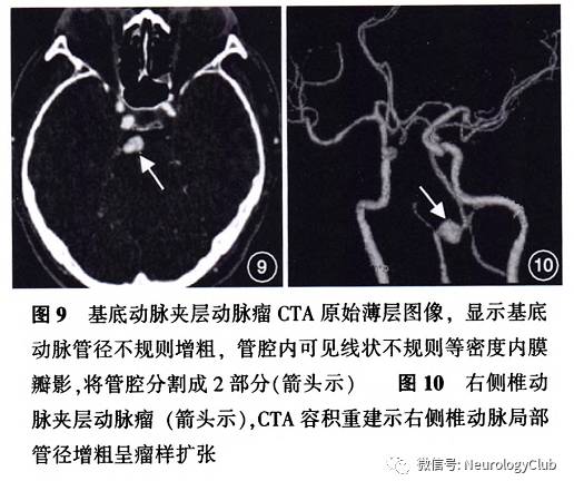 CT图像上观察到偏心性狭窄伴动脉外管径扩张,高度提示IAD病变。壁内血肿CT平扫呈新月形管壁病灶。CTA可显示由壁内血肿引起的管腔狭窄及血管外管径扩张,壁内血肿通常表现为等密度,注入对比剂后无强化。Lum等在2009年对椎动脉夹层病变的研究显示,CTA图像上管壁增厚与管腔直径变化相比是一个更敏感的诊断征象。因此,对于部分管腔直径变化不明显的病例,尤其需要注意CTA薄层原始图像上的动脉管壁增厚表现。有研究显示,动脉外管径增宽与管壁增厚分别可见于93.3%和97.7%的椎动脉夹层患者,但这些征象也可见于非夹层病变。在CTA图像上如果能观察到“双腔征”,对夹层病变可做出明确诊断。真腔一般较窄呈类圆形,为不完全闭塞的血管腔,有对比剂充盈,流速较高;假腔较宽,多呈新月形,为内膜夹层分离所致,由于腔内血流速度较慢,对比剂通过较慢而显示为稍低密度。内膜瓣或夹层动脉瘤的显示是IAD病变的可靠征象。内膜瓣的发现较壁内血肿少见,需要结合CTA薄层原始图像仔细观察(图9,10)。