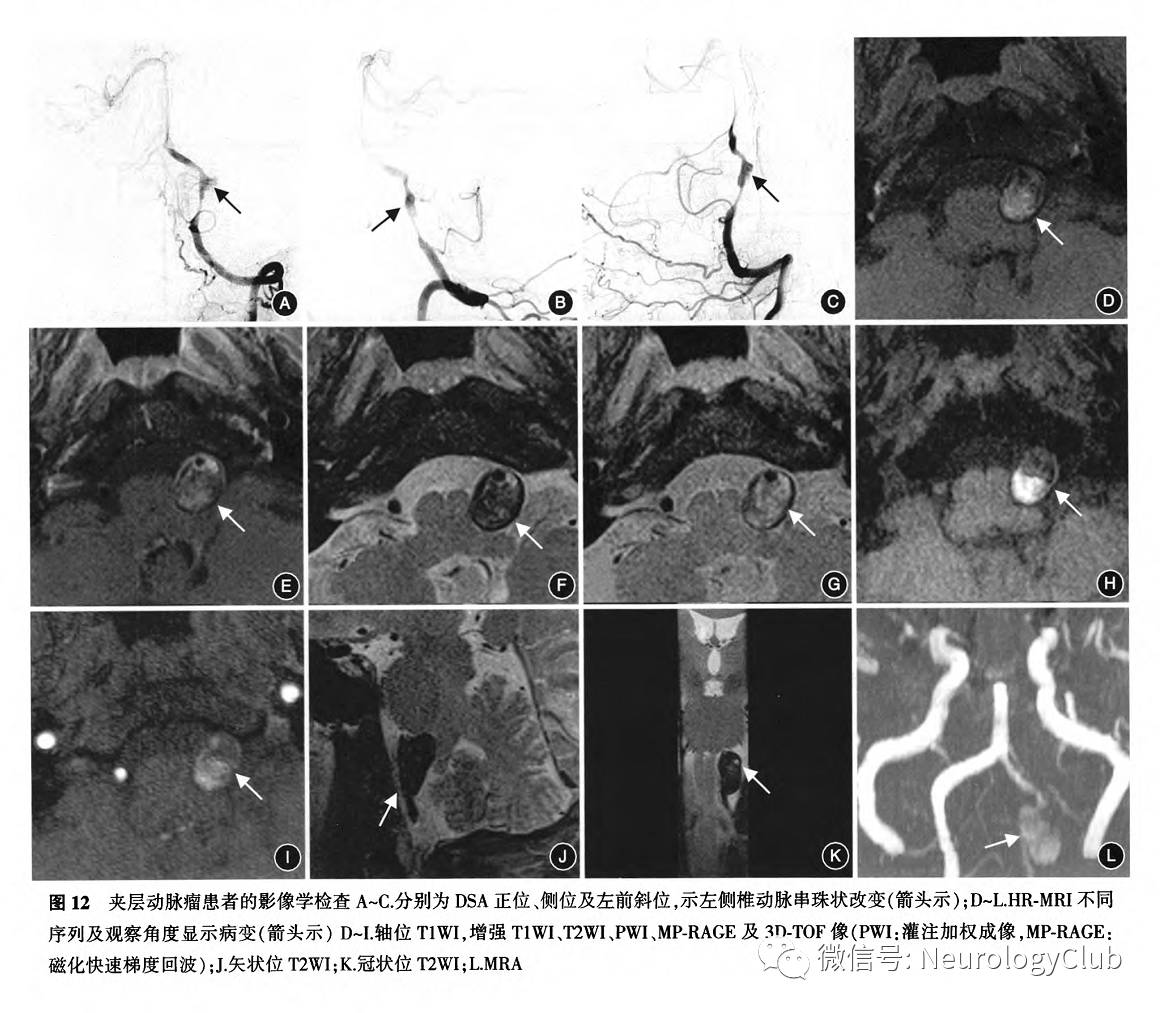 2. IAD的影像学诊断:(1)DSA成像时,血管锥形狭窄闭塞或节段性狭窄伴扩张(串珠征)或者伴有假腔内对比剂晚期滞留可诊断动脉夹层病变。(2)双腔征及内膜瓣是动脉夹层病变的直接征象,CTA、MRA或DSA如发现此征象均可做出诊断。双腔征在CTA原始图像上表现为增强程度不同的2个管腔被线状等密度影区分,在HR-MRI黑血成像上表现为真腔低信号而假腔常见湍流所致的不均匀信号,在DSA上表现为假腔内对比剂滞留。内膜瓣在T2WI和高分辨黑血增强检查时最为明显,呈血管腔内的线状或瓣状结构。(3)亚急性壁内血肿在T1WI、TOF及MP-RAGE序列上显示为高信号,壁内血肿的检出有助于诊断IAD。(4)TOF-MRA,CE-MRA,CTA及DSA均可对受累血管的管腔变化进行评价,包括不规则狭窄、管腔扩张、狭窄伴扩张或完全闭塞(图12)。