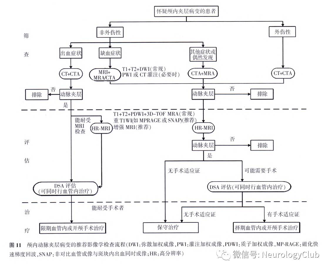 1. IAD的影像学检查推荐流程(图11):(1)对于存在典型临床症状(出血、缺血、神经功能缺损等)及有头颈部外伤史(颅外段夹层的重要病因)的人群,特别是中青年卒中患者,建议进行颅内动脉影像检查以明确或排除夹层病变。(2)对于初次就诊的可疑IAD患者,推荐应用CT+CTA或者MRI+MRA进行初步筛查。(3)全脑DSA是诊断lAD的重要检查手段,也能同时进行血管内治疗,对已明确诊断或高度可疑IAD病变,推荐DSA检查准确评估病变血管的管腔构型、血流方式及侧支循环情况。(4)怀疑创伤性动脉夹层或急诊患者,推荐应用CTA,若结果可疑或不能明确诊断,推荐行HR-MRI或DSA检查。(5)怀疑SAH的患者,推荐行头颅CT平扫明确出血大体部位及严重程度。(6)怀疑颅内缺血性病变推荐行MRI检查,结合DWI明确是否存在急性期梗死灶,必要时行颅脑CT或MRI灌注检查,明确是否存在缺血低灌注区。(7)传统的TOF-MRA或增强MRA可用于动脉夹层的初筛,高度可疑IAD者推荐进一步针对靶血管行HR-MRI检查。HR-MRI以黑血序列为基础,包括与血管垂直的二维T1WI、T2WI和PDWI。椎-基底动脉检查应同时包括3D-TOF-MRA。推荐应用一个重T1加权成像(如MP-RAGE或SNAP序列),以更敏感地检测壁内血肿信号。推荐至少包括1个三维序列,可帮助在不同角度观察病变。推荐同时应用增强MRI检查。(8)经DSA检查确诊或高度怀疑IAD病变的患者,推荐进行HR-MRI检查作为补充,评价血管壁情况,对夹层病变的壁内血肿、内膜瓣及相邻组织受压情况进行评估。同时结合颅脑CT或MRI平扫或灌注检查帮助明确颅内缺血或出血病变等情况。(9)某些IAD病变具有变化较快的特点,对同一病例的前后影像学对比分析非常重要,诊断不明确时推荐短期内进行影像复查,以观察病变的动态变化。