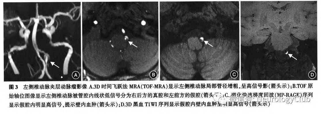 MRI诊断夹层病变的传统成像包括平扫MRI和3D-TOF-MRA。2009年发表的一篇系统性综述总结了1992-2008年的21篇文献,发现MRI对IAD病变诊断的敏感性为50%-100%,特异性为29%-100%;该研究还显示,CT/CTA与MRI/MRA对夹层病变诊断的影像特征无明显的差异。也有研究比较多层螺旋CT/CTA与MRI/MRA在颈段夹层病变中的应用,发现对椎动脉夹层,CT/CTA较传统的MRI/MRA显示病变特征更佳。MRI对亚急性壁内血肿的显示优于其他检查,但TOF-MRA上显示亚急性血肿的高信号可能被误认为血流信号,结合黑血序列或应用CE-MRA可鉴别血流与邻近壁内血肿。TOF-MRA的层面内血流或层块伪影引起的信号丢失可能导致某些水平走行血管内血流信号减低,不利于病变观察。与CT相比,MRI检查对后颅窝病变的显示有优势,能够更好地对后颅窝动脉夹层病变进行评价。