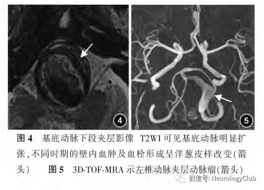 4. 动脉管腔改变(图4,5):动脉夹层所致的动脉管腔改变包括扩张和狭窄,不规则狭窄伴扩张以及完全闭塞。时间飞跃法MRA(time of flight MRA,TOF-MRA)、对比增强MRA(contrast-enhanced MRA,CE-MRA)及高分辨MR(high-resolution MRI,HR-MRI)管壁成像均能清晰显示夹层病变受累血管的管腔变化。如果有夹层动脉瘤形成,可见局部管腔不规则扩张。体积较大的夹层动脉瘤形成往往伴有周围组织的明显受压移位,夹层动脉瘤内反复出血及血栓形成表现为MRI上葱皮状混杂信号影(图4)。有时可见脑干因椎-基底IDA的明显压迫而变形。MRI可同时显示受累血管供血区的缺血梗死改变或其他脑组织的继发变化。