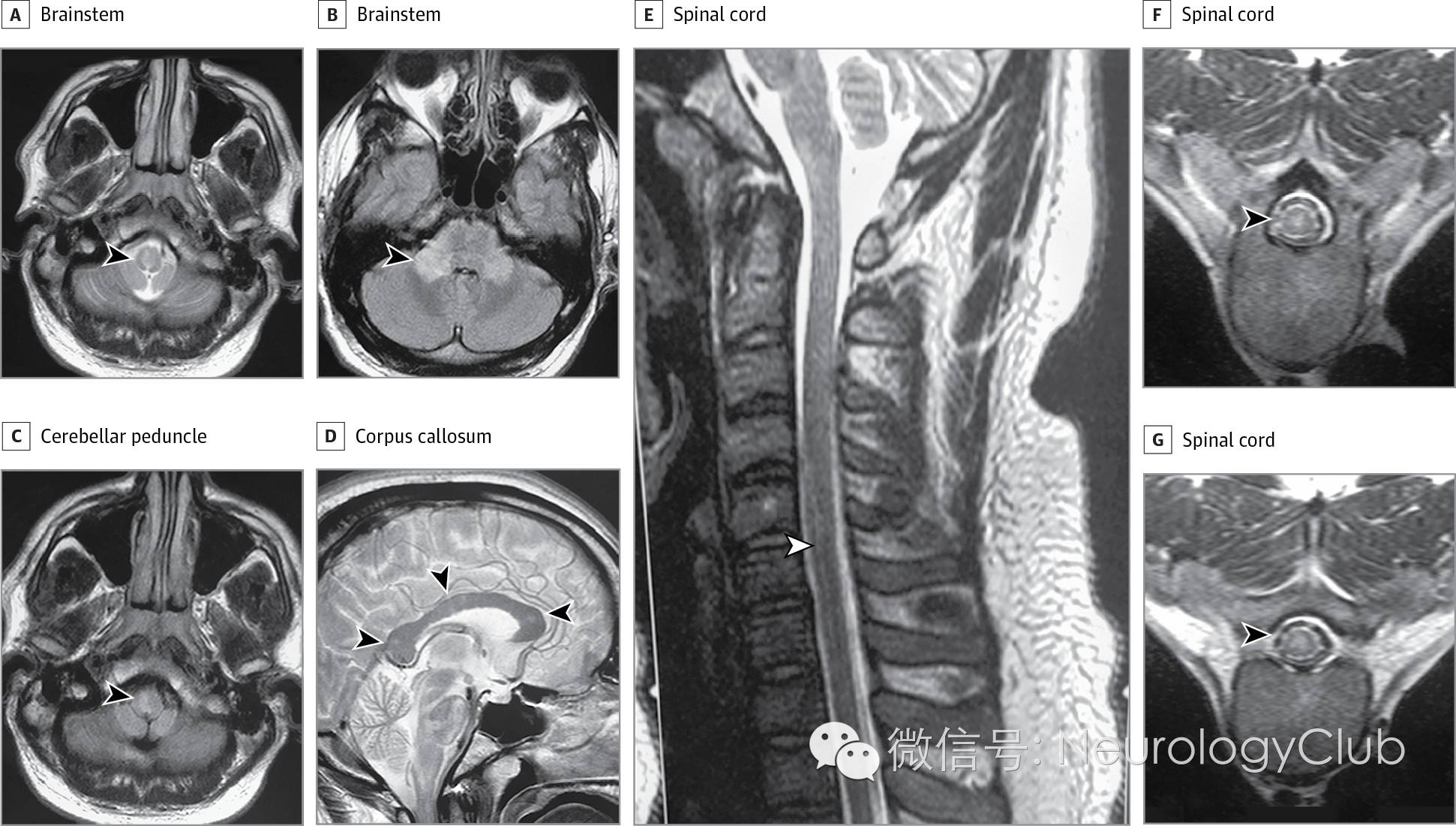 (图:MRI提示脑干,小脑脚,胼胝体和脊髓[C3-C6椎体]脱髓鞘病变[箭头])