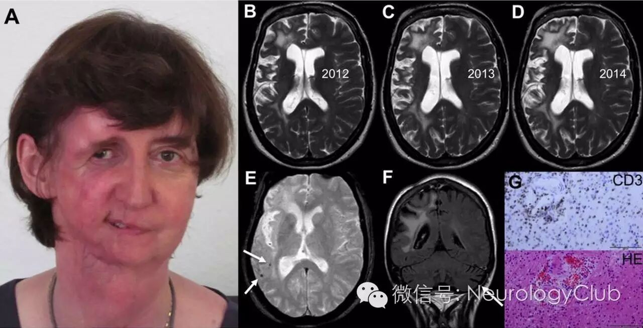 (图:A:右侧面部萎缩;B-D:3年的随访MRI提示右侧大脑半球白质T2高信号明显进展,伴萎缩加重;E:T2*可见右侧大脑半球微出血或微钙化[箭];F:FLAIR可见大脑萎缩伴对侧小脑萎缩[箭];G:2个不同区域可见血管周围T细胞浸润[CD3和HE染色,×200,标尺100 µm])