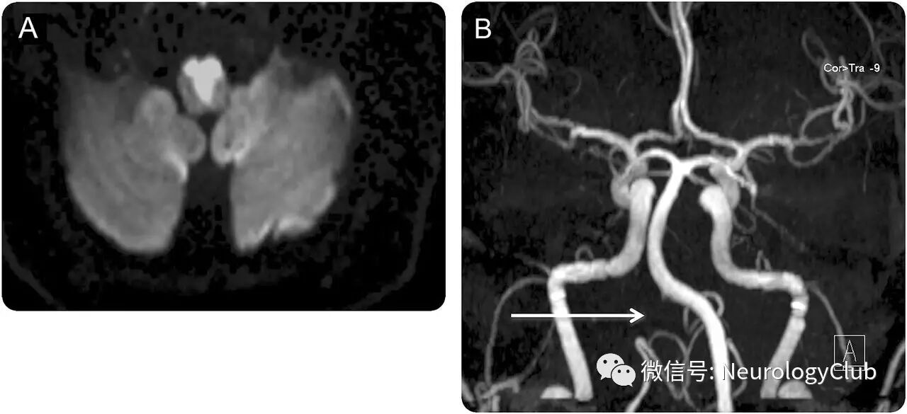 (图:A:DWI:双侧延髓内侧面梗死;B:MRA:右侧V4闭塞[白箭])