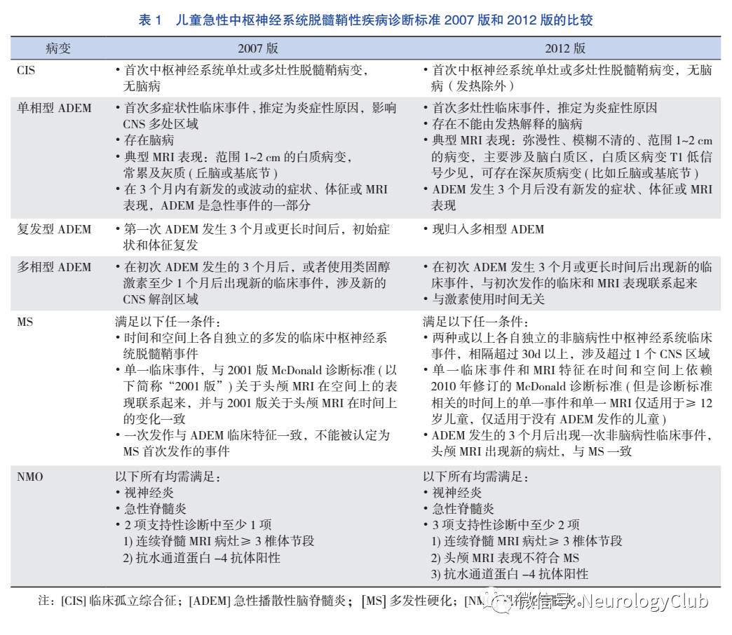 2007年,国际儿童多发性硬化研究小组(International Pediatric Multiple Sclerosis Study Group,IPMSSG)提出了儿童中枢神经系统(central nervous system,CNS)获得性脱髓鞘疾病的暂行诊断标准,即2007版诊断标准,这些疾病包括儿童急性播散性脑脊髓炎(acute disseminated encephalomyelitis,ADEM)、儿童临床孤立综合征(clinically isolated syndrome,CIS)、儿童视神经脊髓炎(neuromyelitis optica,NMO)和儿童多发性硬化(multiple sclerosis,MS)。由于2007版诊断标准的推行,统一了术语命名,在客观上促进了CNS获得性脱髓鞘疾病在临床和科研上的进步,但之后的研究和临床应用显示了其局限性。因此,IPMSSG在2012年提出了新的诊断标准共识,其中包括儿童CIS、儿童ADEM、儿童MS和儿童NMO。笔者作为IPMSSG在中国地区仅有的两名成员,在原有文献基础上,结合自己多年临床和科研积累,对2012版共识作一解读,使其在未来临床和科研工作中更具有可操作性。表1总结了2007版和2012版的差异。