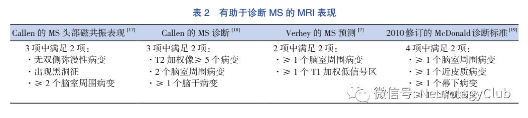 表2列举了一些儿童MS的MRI特点,有助于明确儿童MS的诊断和首次发作后复发风险的评估。中枢神经系统脱髓鞘事件首次临床发作,MS的头颅MRI表现比ADEM更具预测性,包含脑室周围病灶、T1加权低信号灶和双侧边缘清晰的斑块。2010版McDonald诊断标准虽在成人MS的研究基础上得出,但对儿童MS的早期诊断仍具参考意义。IPMSSG 2012版关于MRI表现的阐述较2007版更具体详细,然而对年幼MS患者早期诊断和疾病发展的预测价值较低,因此仍需进一步研究和修订年幼MS患儿具体详实的MRI诊断标准。