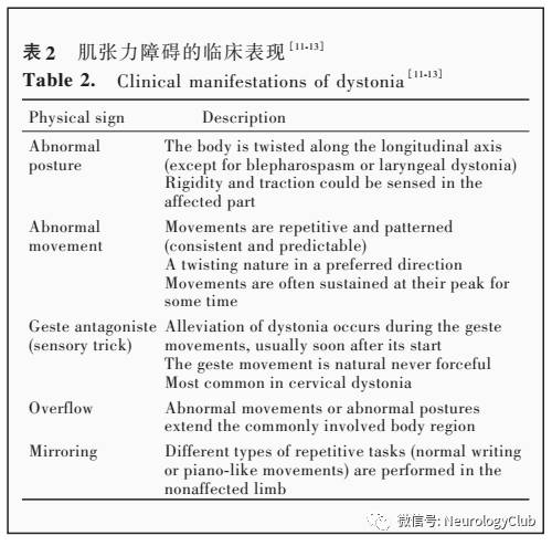 根据临床表现判断是否为肌张力障碍。肌张力障碍的主要临床表现包括异常运动或异常姿势(伴或不伴震颤)、感觉诡计(sensory trick)或拮抗动作(geste antagoniste),泛化现象、镜像现象(mirroring)等(表2)。此时应注意排除假性肌张力障碍,临床表现为持续性异常姿势而易误诊为肌张力障碍,如先天性斜颈、眼性斜颈、颅颈交界区动-静脉瘘致斜颈、表现为持续性扭转姿势的癫痫发作、Arnold-Chiari畸形、僵人综合征(SPS)等。