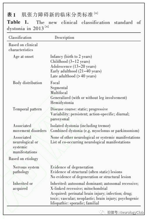 目前,任意一种单一临床分类方法均不能满足肌张力障碍基础与临床研究的需要。鉴于此,Albanese等于2013年提出肌张力障碍新的临床分类标准(表1),根据临床特征和病因两个主体进行分类,新标准旨在为所有类型肌张力障碍患者提供实用性临床信息,并指导诊断与治疗及开展后续研究。