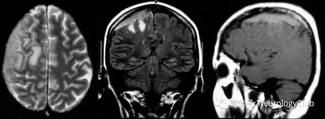 (图1:左:T2WI可见12×12×20mm右侧凸面高信号病灶伴中度占位效应;中:FLAIR可见右侧凸面高信号病灶伴其下脑组织水肿;右:T1WI可见稍高信号病灶)