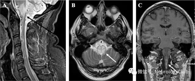 (图1:矢状位[A]和横断面[B]T2WI以及T1增强可见脑干病灶[箭])