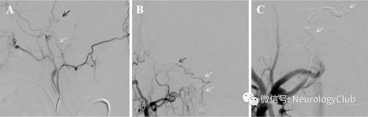 (图2:A-B:脑膜中动脉后分支血管造影可见硬脑膜动静脉瘘[箭];C:栓塞术后可见瘘点消失)