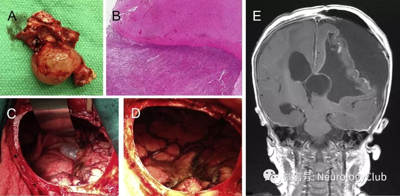 (图2:A:手术切除强化病灶和附着的囊;B:石蜡包埋切片HE染色证实肿瘤与邻近脑组织界限清楚[×20];C-D:完整切除,可见同侧侧脑室,上盖薄的皮质边缘;E:术后复查增强T1WI证实占位效应解除,可见小的局灶性强化,支持血液成分和术后改变)
