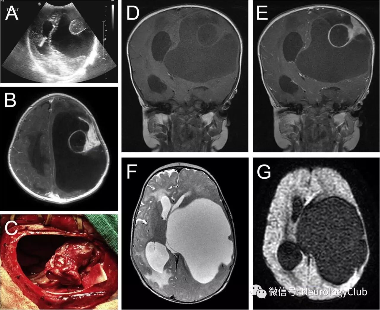 (图:A:超声证实左侧脑室明显扩张,伴边界清楚的高回声结节状病灶;B、E:增强T1WI;D:T1WI;F:T2WI;G:DWI;C:大囊肿术中引流所见;头颅MRI可见左侧大脑半球复杂的大囊,T2上与脑脊液等信号,DWI上未见弥散受限,增强时可见附着于硬脑膜的明显强化病灶,伴囊性成分)