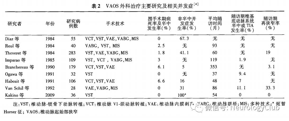 症状性动脉粥样硬化性VAOS外科治疗的主要方式有转植和搭桥手术。最早报道的VAOS的外科治疗是1958年采用椎动脉-颈总动脉的转植。1990年Ausman等报道的一组颅内动脉搭桥治疗VAOS导致的后循环管缺血83例,结果有8.4%的病死率及13.3%的并发症发生。其他的关于外科治疗的研究总结见表2。