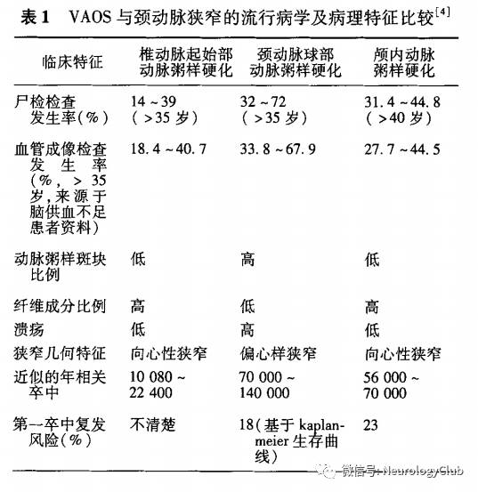 VAOS由于研究基于的人群及观察方法不同,报道的VAOS发生率有较大的差异、Hass等对3788例脑血管造影患者的观察发观,VAOS是仅次于颈动脉分叉部狭窄的脑血管狭窄好发部位。一项基于935例健康及卒中患者的增强MRA检查研究发现,VAOS的发生率为12.7%。两项基于尸检及血管造影检查研究显示,在有心脑血管危险因素的人群中,有超过50%的患者有VAOS。VAOS病理及形态与颈动脉狭窄也有不同。关于VAOS的狭窄发生率及病理见表1。2014年,一项基于门诊无症状人群的超声研究提示,VAOS及闭塞的发生率为15.4%。