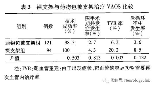 Song等2012年报道一组206例患者药物包被支架与裸支架指教VAOS的对照研究,结果如表3。