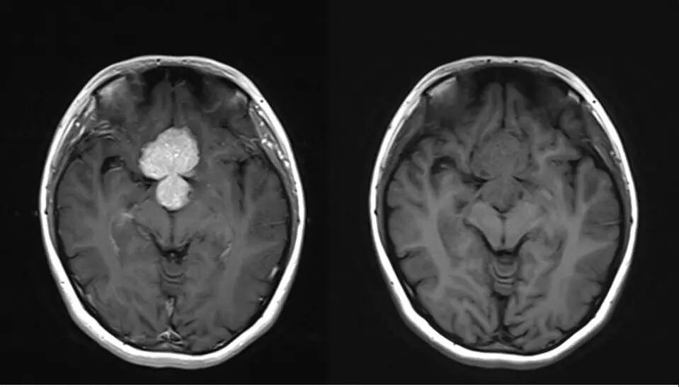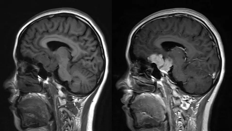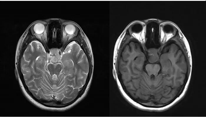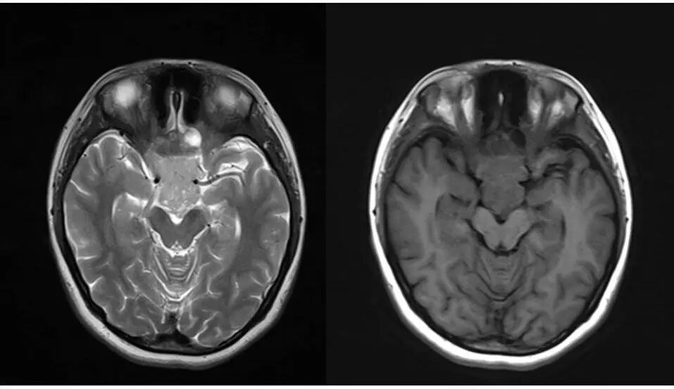 2.生殖细胞瘤:生殖细胞瘤位于鞍区,多见于女性,呈不规则形稍长T2、稍长T1异常信号影,其内信号可不均匀,但与垂体分界清楚,注药后呈明显强化;
