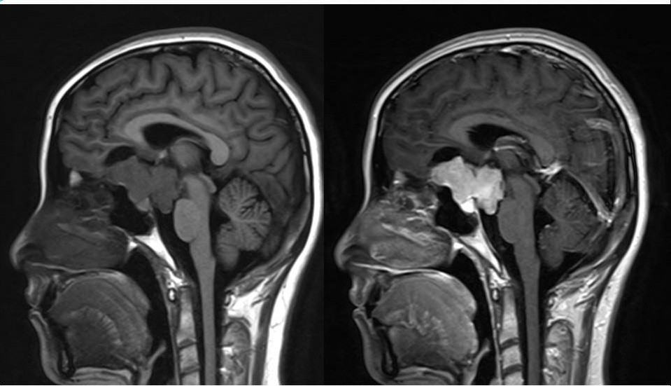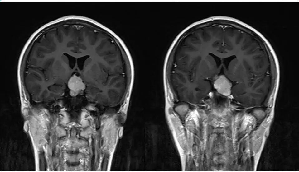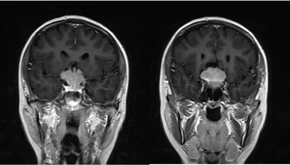 4.重点观察冠状位:病变源于垂体偏左侧,与垂体界限不清楚,肿瘤偏右侧可见垂体与肿瘤之间裂隙,造成矢状位平扫及强化后误认为正常垂体存在,从而首先除外了垂体瘤,导致误诊;