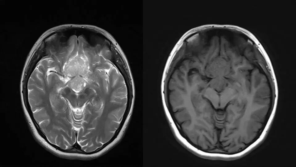 3.颅咽管瘤:实性颅咽管瘤多为鳞状乳头型,位于鞍上,可呈稍长T2、稍长T1异常信号影,边界清楚,内部信号均匀,注药后明显均匀强化,且与垂体界限清楚;