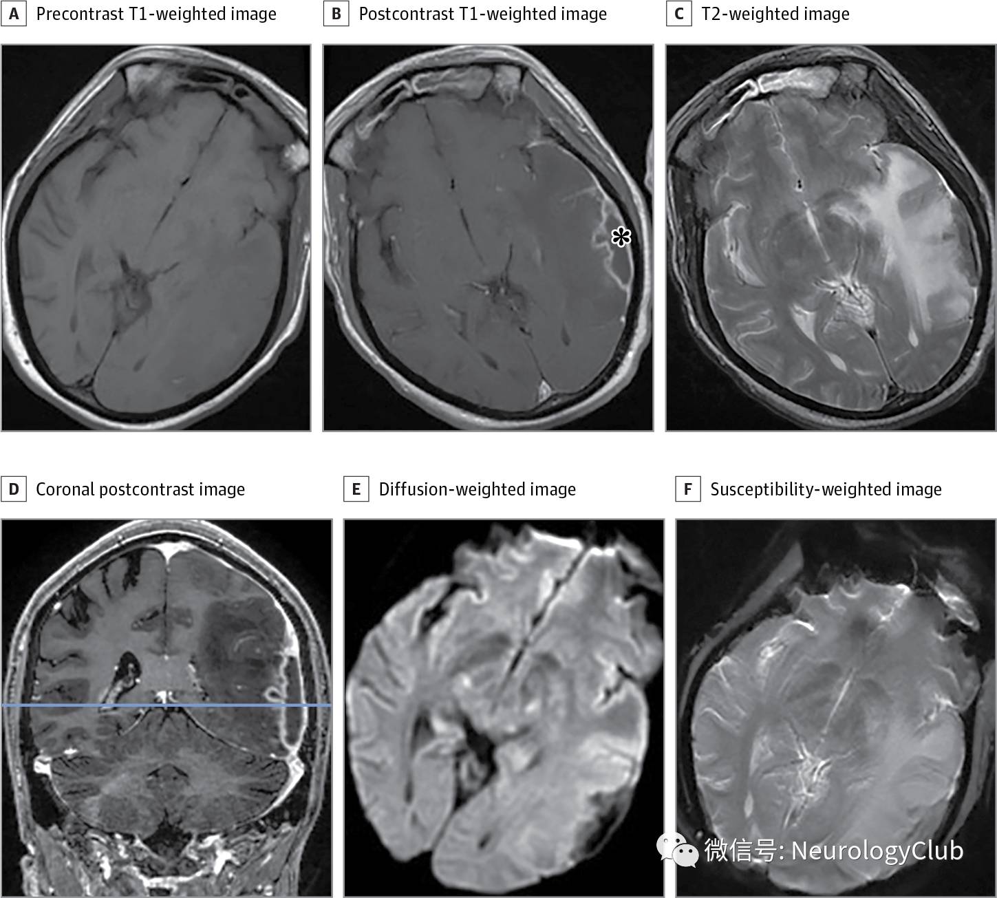 (图:A:T1WI;B:T1增强可见不规则环形强化[*为活检部位];C:T2WI可见广泛水肿;D:冠状位T1增强可见弥漫硬脑膜强化;E:DWI未见结核瘤内弥散受限;F:SWI未见出血)
