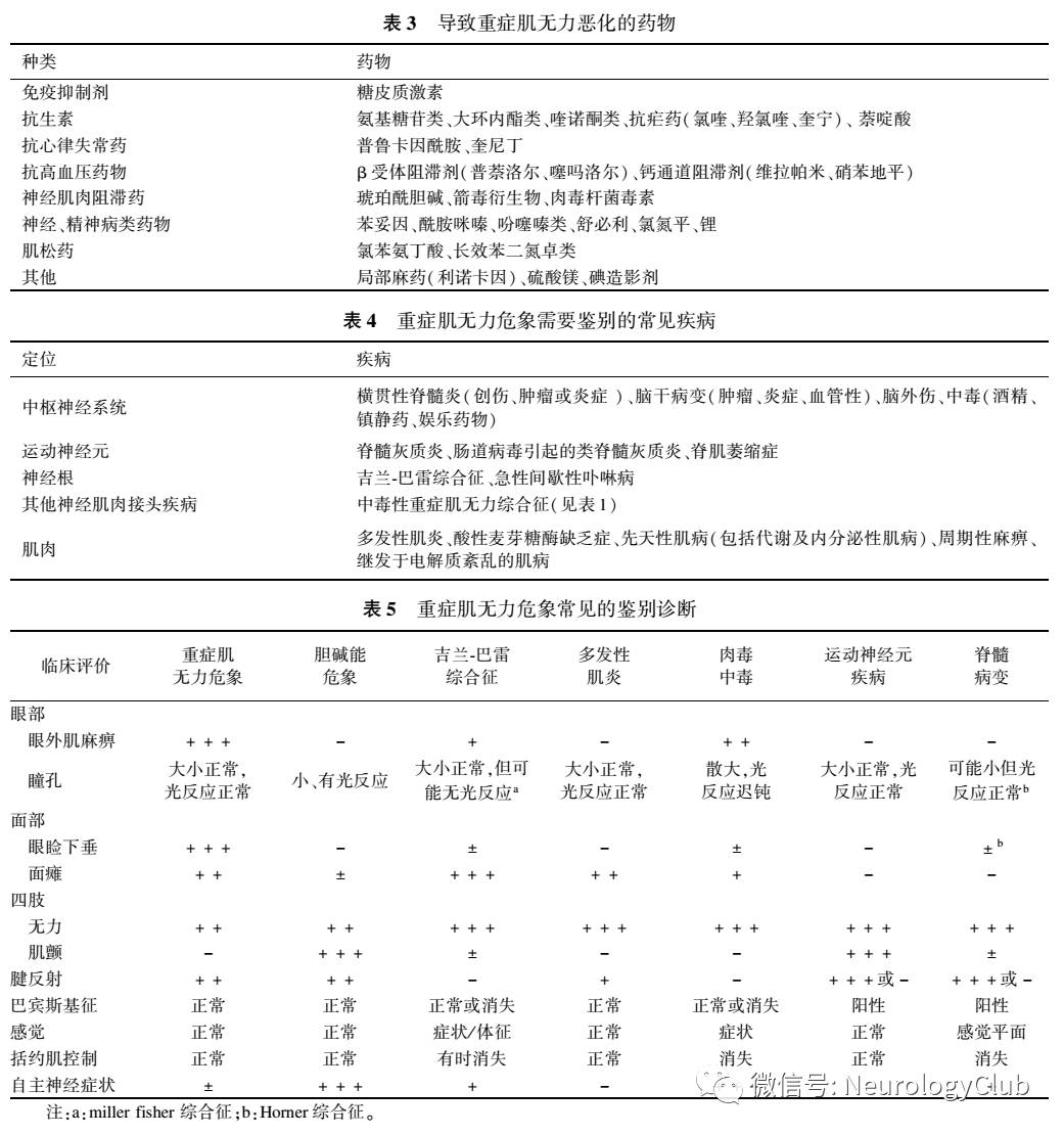 5.2 触发因素的处理 感染是重症肌无力危象患者最常见的触发因素,包括肺炎、支气管炎、泌尿系感染、难辨梭状芽孢杆菌结肠炎、菌血症和脓毒症。长期使用免疫抑制剂、呼吸肌无力及球麻痹是导致患者感染的主要危险因素,病原除常见的细菌谱外,还需特别注意免疫缺陷相关机会菌的感染。 避免使用导致重症肌无力恶化的各类抗生素,如氨基糖苷类、大环内酯类、喹诺酮类及四环素类。仔细寻找其他诱因,给予相应处理,停用或避免使用导致重症肌无力恶化的各类药物。需强调,糖皮质激素既是重症肌无力患者的治疗用药又是触发因素,文献报道因使用糖皮质激素导致重症肌无力恶化的发生率在9%-18%,因此,开始使用糖皮质激素治疗重症肌无力时,应在有监护设备的地方进行。关于持续使用胆碱酯酶抑制剂治疗重症肌无力危象尚存有争议,主要的顾虑在于心血管的并发症,以及大量使用胆碱酯酶抑制剂会导致唾液、胃液和支气管过度分泌,增加误吸和呼吸困难的风险。因此,无论患者是重症肌无力危象或胆碱能危象,均主张停用胆碱酯酶抑制剂。