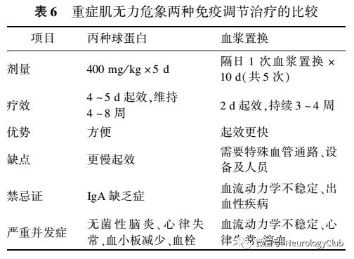 5.3 免疫调节治疗 重症肌无力危象两项重要的免疫调节治疗为IVIG和PE。具体方案和优缺点见表6。若单用上述两种治疗无效或疗效不佳,可在使用IVIG后加用PE或PE后加用IVIG。尽管在IVIG后使用PE有移除抗体的担忧,但患儿既然已对IVIG失效,这种担忧是不必要的。现有的一些证据提示,PE比IVIG在重症肌无力危象治疗方面更有效。一项针对成人重症肌无力危象患者的多中心回顾研究提示,PE在“1周的临床疗效”、“2周的呼吸功能”、“1个月的功能恢复”3个方面均优于IVIG,但PE的并发症更多,尤其是感染及血流动力学不稳定。相反,另一项前瞻性研究并未发现两者之间的差异,但这项研究的病患并非局限于重症肌无力危象。成人资料显示,在接受PE或IVIG初始治疗后,约1/5患者需接受第2次治疗,且以IVIG为初始治疗者接受2次治疗的几率更高。另一项病例研究还发现,初始IVIG治疗无效者使用PE均获得良好疗效。