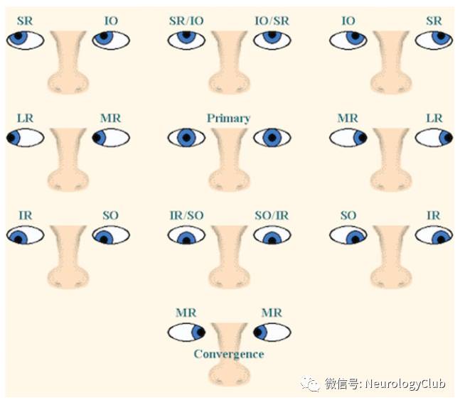 (图:不同凝视方向参与的眼外肌。SR:上直肌;IO:下斜肌;IR:下直肌;LR:外直肌;MR:内直肌;SO:上斜肌)