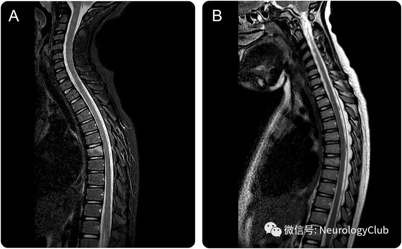 (图:A:背部外伤后的脊髓MRI提示T7椎体楔状骨折伴水肿,未见脊髓实质病灶;B:背部外伤1月后复查脊髓MRI提示T7椎体水肿消失)
