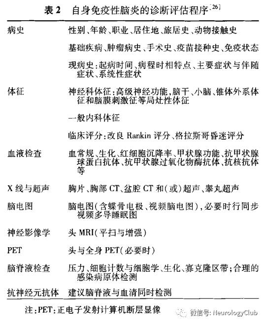 2. 辅助检查:具有以下1个或者多个的辅助检查发现,或者合并相关肿瘤。(1)脑脊液异常:脑脊液白细胞增多(>5×10^6/L);或者脑脊液细胞学呈淋巴细胞性炎症;或者脑脊液寡克隆区带阳性。(2)神经影像学或者电生理异常:MRI边缘系统T2或者FLAIR异常信号,单侧或者双侧,或者其他区域的T2或者FLAIR异常信号(除外非特异性白质改变和卒中);或者PET边缘系统高代谢改变,或者多发的皮质和(或)基底节的高代谢;或者脑电图异常:局灶性癫痫或者癫痫样放电(位于颞叶或者颞叶以外),或者弥漫或者多灶分布的慢波节律。(3)与AE相关的特定类型的肿瘤,例如边缘性脑炎合并小细胞肺癌,抗NMDAR脑炎合并畸胎瘤。