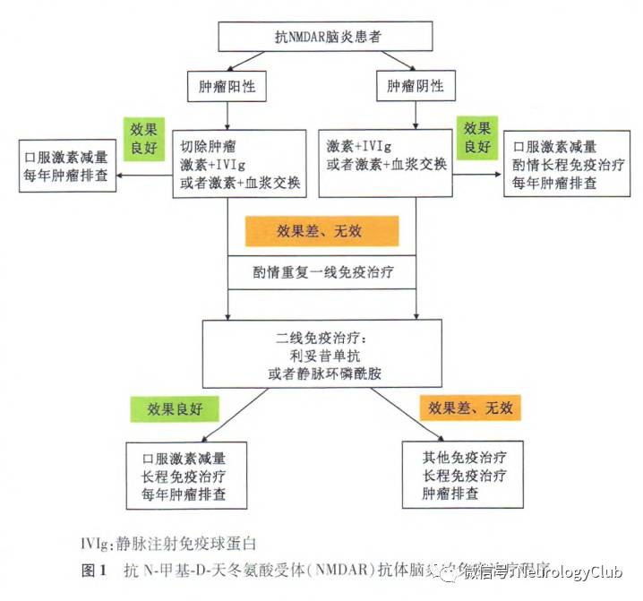 分为一线免疫治疗、二线免疫治疗和长程免疫治疗。一线免疫治疗包括糖皮质激素、静脉注射免疫球蛋白(IVIg)和血浆交换。二线免疫药物包括利妥昔单抗与静脉用环磷酰胺,主要用于一线免疫治疗效果不佳的患者。长程免疫治疗药物包括吗替麦考酚酯与硫唑嘌呤等,主要用于复发病例,也可以用于一线免疫治疗效果不佳的患者和肿瘤阴性的抗NMDAR脑炎患者(图1)。对可能的AE,也可酌情试用一线免疫治疗药物。