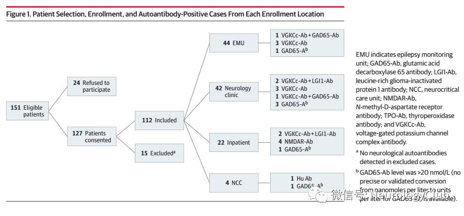 近日,来自美国德州大学西南医学中心的Dubey教授团队开展了一项关于不明原因癫痫患者中神经相关抗体的出现情况的研究。其纳入标准:2015年6月至2016年6月之间,新发癫痫(间隔24小时以上的2次非诱发性癫痫发作,或1次非诱发性癫痫发作,但临床上提示高度复发可能)或不明原因的癫痫病史。排除标准:1.潜在的代谢异常,如低血糖或高血糖,严重的肝肾功能异常;2.脑结构异常,如卒中、肿瘤、头颅外伤、脑血管畸形、脑脓肿、先天性发育异常;3.怀疑染色体或基因疾病,先天性代谢异常所致的发育迟滞伴有癫痫。抽取患者的血清,检测如下抗原的抗体:NMDAR(N-甲基-D-天冬氨酸受体)、VGKC(电压门控钾离子通道)、LGI1(富亮氨酸胶质瘤失活1蛋白)、GAD65(谷氨酸脱羧酶)、GABAB(γ-氨基丁酸受体)、AMPAR(α-氨基-3-羟基-5-甲基-4-异恶唑丙酸)、ANNA-1(抗神经元核抗体1型,即抗Hu)、PCA-2(浦肯野细胞胞质抗体2型) 、Amphiphysin(两性蛋白)、CRMP-5(脑衰反应调节蛋白-5)、TPO(甲状腺过氧化物酶)。