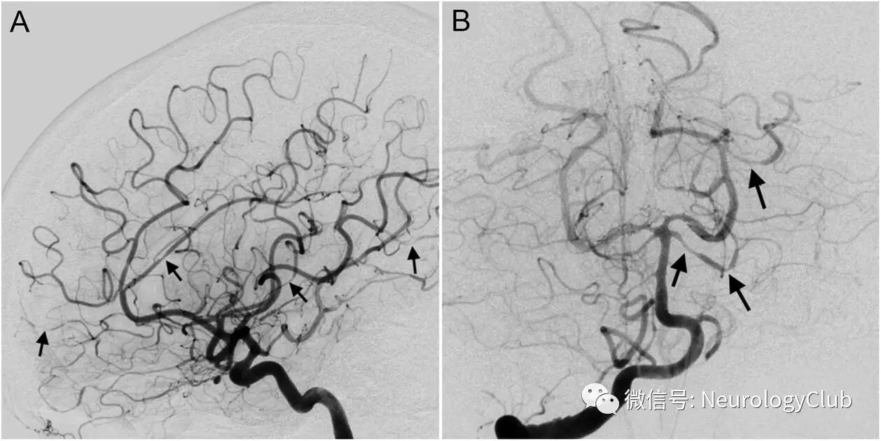 (图2:A:右侧颈内动脉血管造影;B:右侧椎动脉血管造影;多处血管支配可见多灶性节段性血管收缩[箭])