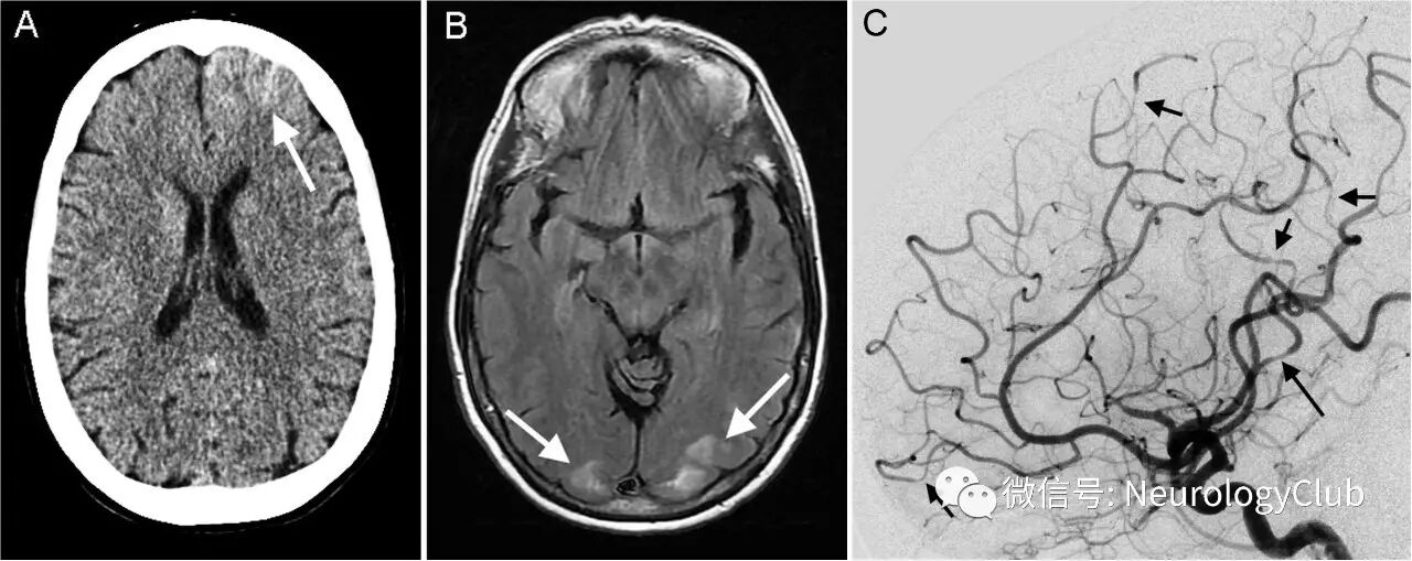 (图1:A:CT;B:FLAIR;C:左侧颈内动脉脑血管造影)