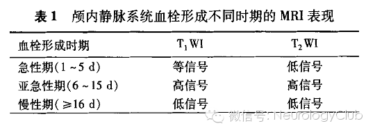 可直接显示颅内静脉和静脉窦血栓,以及继发于血栓形成的各种脑实质损害,较CT更为敏感和准确,但血栓表现随发病时间不同而变化(表1),其中又以亚急性期的血栓高信号对CVST诊断较为可靠。磁敏感加权成像(SWI)或E加权梯度回波(FGE)等序列较MR常规序列对显示脑内出血更加敏感,对诊断CVST比常规系列成像具有更高的敏感度和特异度。头颅MRV可发现相应的静脉窦主干闭塞,皮质静脉显影不良,侧裂静脉等侧支静脉扩张,板障静脉和头皮静脉显像等征象。在大多数情况下,MRI/MRV已可对CVST进行准确诊断,且所用增强剂更安全又没有X线辐射,被认为是诊断和随访CVST的最佳手段,但局部单纯的皮质静脉显示能力较弱,以及不能判断静脉血流方向是其主要不足之处。在MRV发现一侧静脉(窦)血流缺失时,并不能判断是由于血栓或是先天闭塞所造成。有研究者建议,若CT上双侧下颌切迹对称则支持CVST的诊断。MRV包括时间飞跃MRV(TOF MRV)、相位对比血管成像(PCA)和对比增强MRV(CE MRV)3种成像方法,与TOF MRV和PCA相比,CE MRV由于消除了血管内湍流,使颅内静脉和静脉窦显示更为清晰,如同时结合数字减影MRA(DSMRA)和最大密度投影(MIP)重建等技术,可多角度显示静脉血管的三维影像,因此,CE MRV可作为MRV的首选成像方法。