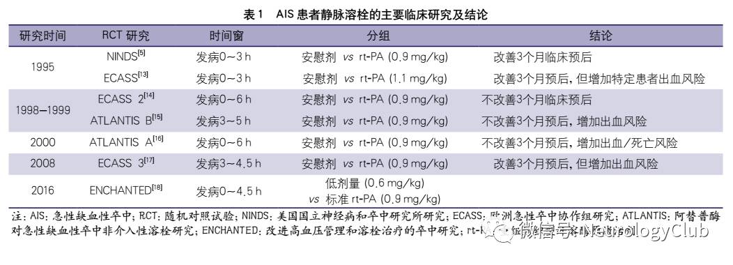 1995年美国国立神经病和卒中研究所(National Institute of Neurological Disorders and Stroke,NINDS)研究首次证实符合适应证AIS患者发病3h内静脉rt-PA溶栓是安全有效的,能显著增加生存及非残疾比例,而且越早越好,也得到了欧洲和中国溶栓登记研究的支持。2008年欧洲急性卒中协作组研究(Effect of the European Cooperative Acute Stroke Study,ECASS)-3研究显示对发病3.0-4.5h AIS患者进行rt-PA静脉溶栓也可显著增加3个月良好预后,认为AIS溶栓时间窗可延长至发病4.5h内。随后中国和国际溶栓登记研究以及2010年溶栓汇总分析均为发病3.0-4.5h静脉rt-PA溶栓能够获益提供了进一步证据(表1)。目前国际脑血管病指南一致推荐,基于临床和颅脑计算机断层扫描(computed tomography,CT)平扫选择的AIS患者在发病后4.5h内进行rt-PA静脉溶栓是安全有效的。我国尚未批准AIS发病3-4.5h rt-PA静脉溶栓治疗,目前正在进行临床试验。