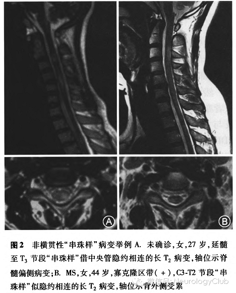 一般来讲,典型的MS脊髓病变较短,通常不超过2个椎体节段。值得注意的是,本研究中有3例MS患者,其中1例为儿童起病的MS,这与LETM可见于儿童MS患者的其他报道一致;而另2例 实际上是新老病变接续造成“长节段”脊髓病变的假象,临床上需谨慎鉴别。因而,严格意义上讲,LETM绝大多数是NMOSD,偶见于儿童发病的MS。值得一提的是,有1例暂归入NMOSD的呈多节段断续的“串珠样”脊髓病变(图2A),其四脑室周围有长T2病变、病变段脊髓肿胀,血清AQP4-IgG(滴度1:320)、SSA、SSB抗体均阳性,肾脏活检病理符合系统性红斑狼疮病变,这些似乎支持NMO的诊断,但伴有系统性自身免疫病的NMO患者的脊髓病变几乎均为长节段横贯性损害,本例有不符合之处;另一种可能是,ANA、ENA、SSA等抗体阳性的血清如未经严格的非特异性抗体吸附过程,很容易形成AQP4-IgG假阳性结果,故不除外系统性自身免疫病伴发脊髓病的可能。