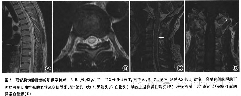 然而,LESCL并非NMOSD所特有。2例ADEM患者亦出现LETM病变,患者均有典型的临床症状及与脊髓病变同时相的脑内多发病变,有助于ADEM诊断;此2例脊髓病变并无与延髓及四脑室相连的倾向,而终止于高位颈髓,可能是与NMO病变的区别之一,但鉴于病例数太少,不便得出武断的结论。硬脊膜动静脉瘘的特征性MRI表现能帮助临床确诊,因此,虽然选择性脊髓血管造影是确诊硬脊膜动静脉瘘的金标准,但其具有操作复杂及有创性的缺点,使得临床上常常首先进行实用性更强的MRI检查帮助诊断。