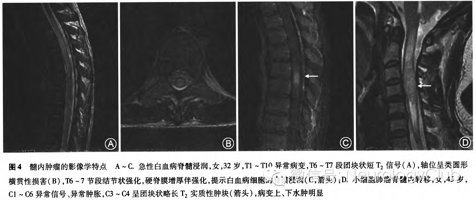 结果 51例患者中,视神经脊髓炎谱系疾病(NMOSD)25例,孤立性长节段脊髓炎6例,亚急性联合变性4例,多发性硬化(MS)、副肿瘤性脊髓病变、脊髓前动脉综合征各3例,急性播散性脑脊髓炎和硬脊膜动静脉瘘各2例,脊髓转移瘤、白血病脊髓浸润以及脊髓中央管扩张各1例。NMOSD多是脊髓中心为主的横贯性、纵向延伸的连续性长T2病变,急性期脊髓肿胀明显,增强扫描可见部分强化;其他疾病的MRI表现也各有特点。