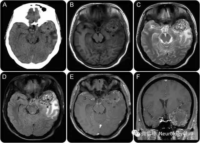 (图1:A:CT可见不均匀的含有多发低密度囊性变的实体肿块伴周围广泛水肿;B-D:T1WI,T2WI和FLAIR可见不均匀信号的球形肿块伴多发中央囊性坏死区;E-F:增强MRI可见病灶边缘不规则强化)